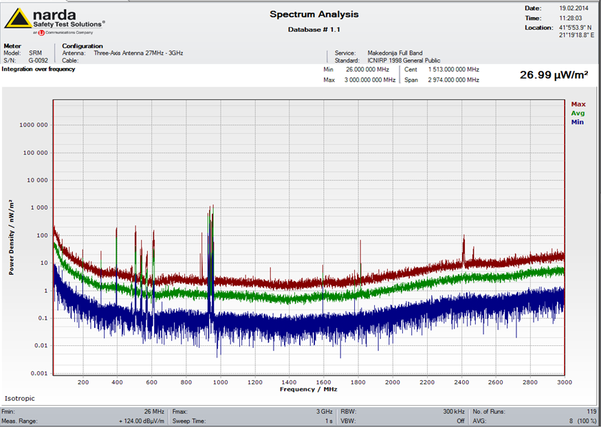 Заклучок: Од добиените резултати може да се заклучи дека максималната изложеност на нејонизирачки зрачења е помала од пропишаните гранични вредности.